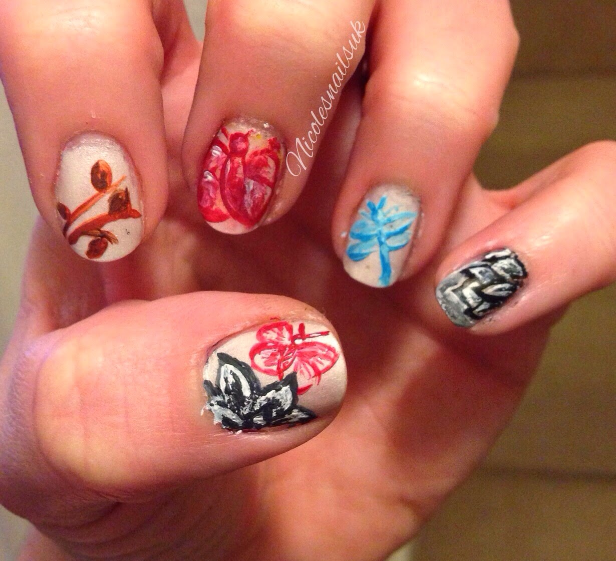 I've gone with a wildlife type theme for this mani and decided to put something different on each finger. My favourite has to be how my thumb nail turned out though, will the small butterfly and flower :)