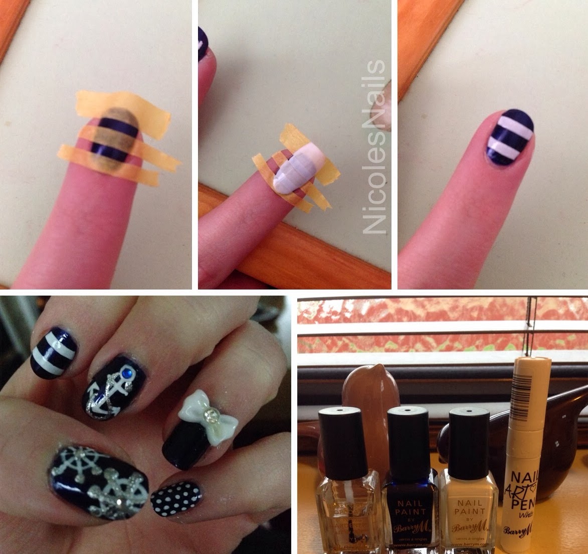Everything today was done with the wonderful BarryM, the base is navy which was done the night before so all the designs are easier to do as there's no tackyness. The anchor, polka dots and the helm are done with BarryM's white art pen, which I love :) and then of course BarryM clear top coat to keep everything protected. The bow is added with nail glue and the little gems were just put on while the top coat was wet using a cuticle stick.