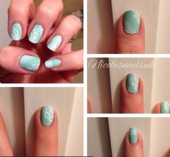 I've done the lace pattern freehand and just went with whatever pattern I fancied, and I've done a slight accent nail on the ring finger by doing a criss-cross pattern with a couple of simple flowers to make it look different from the other nails.