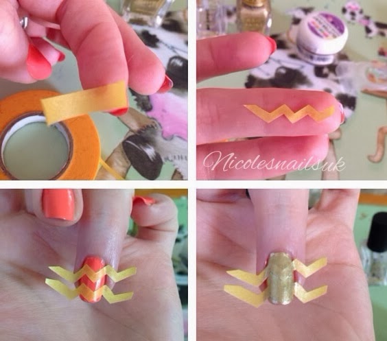 Cut small triangles into each side of the tape (I used nail scissors as they are much easier to see what you are cutting), obviously the smaller the triangle the more zig zags you will get. Stick the tape to the nail, make sure it's all stuck down well, so no polish can get under the tape. Then paint over your whole nail with your chosen colour. I've used BarryM's Gold for this as it goes really well with the orangy colour for the base. While the paint is still wet slowly peel off the tape and you should be left with your zig zag pattern.