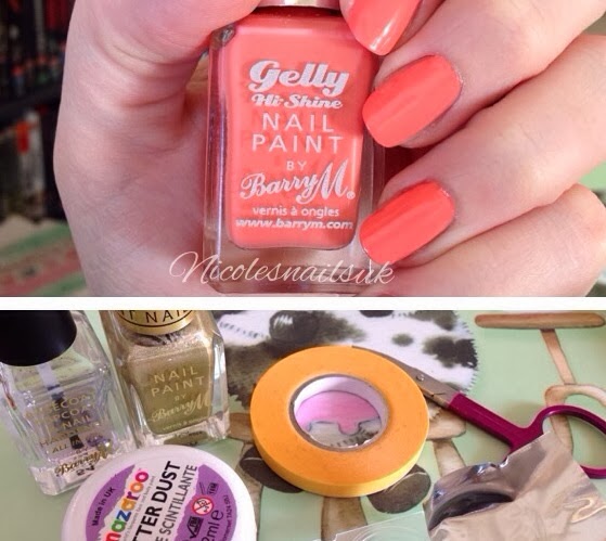 The base colour is BarryM's 'papaya' Gelly, which is a lovely bright orange/coral colour. I've done about four coats for this, so it's nice and thick. Once this is really dry you can then start on the zig zag pattern, I've just done an accent ring finger as it's quite fiddly! Use any sort of tape for the next part, I've used masking tape, but normal tape is fine too.