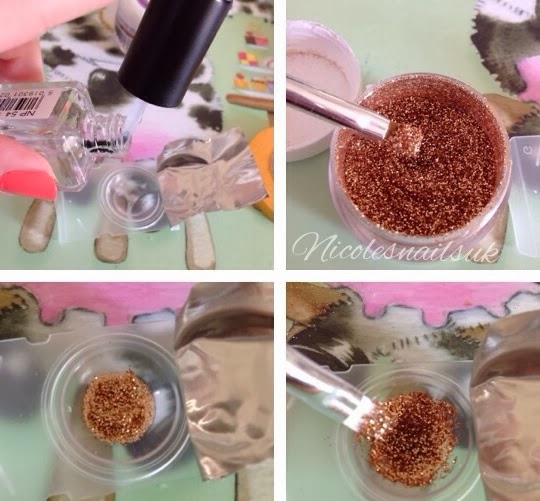 Next I wanted to add some glitter to the mani. Now as much as I've got some lovely glitters in my collection, none of them were quite what I was looking for so I thought I'd make my own! You just need some clear top coat for this and some dry glitter. I've used an empty contact lens case to do this so I could just throw it away afterwards.