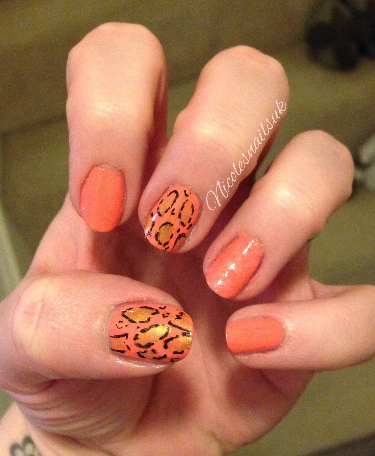 To do the leopard print I just added different shapes and sizes of gold to the coral and then once these were dry I used my BarryM pen to roughly draw around the edges of each gold patch.